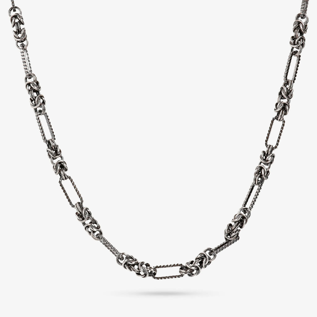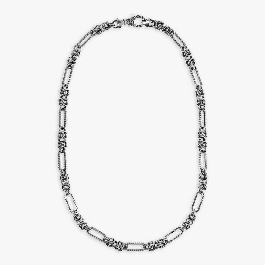 Collana unisex Albert M. in argento 925 con catena bizantina alternata a maglie rettangolare con superficie lavorata; chiusura a moschettone con texture sirena.