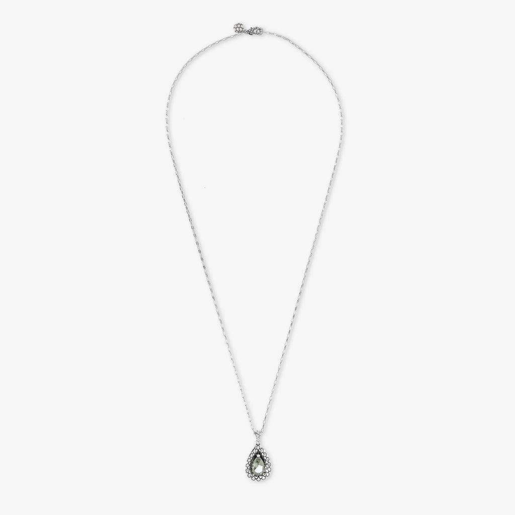 Collana in Argento 925 con "Ink texture" Sirena. Maglia forzatina con pendente a goccia (29x20 mm), impreziosito da una pietra naturale sfaccettata di ametista verde (15x10 mm). Lunghezza 74 cm. Chiusura a moschettone con texture sirena.