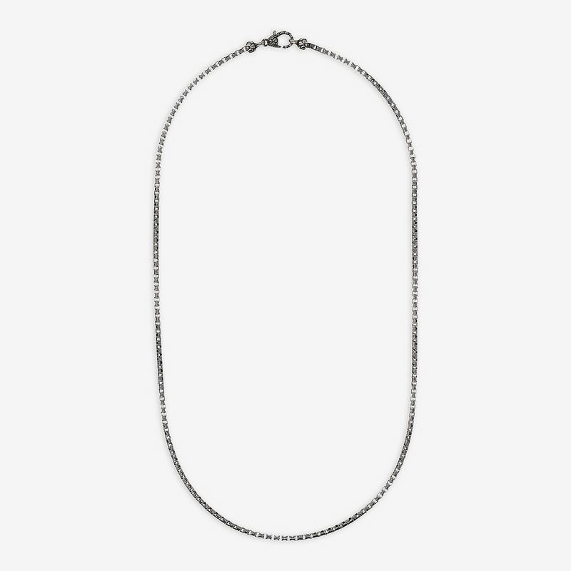 Collana uomo Albert M. realizzata su base di argento 925 con catena veneziana sottile; chiusura a moschettone con texture serpente. Disponibile in due misure: short (50 cm) e long (60 cm). Creazione originale che può essere facilmente indossata con qualsiasi abito.
