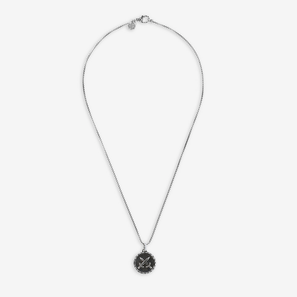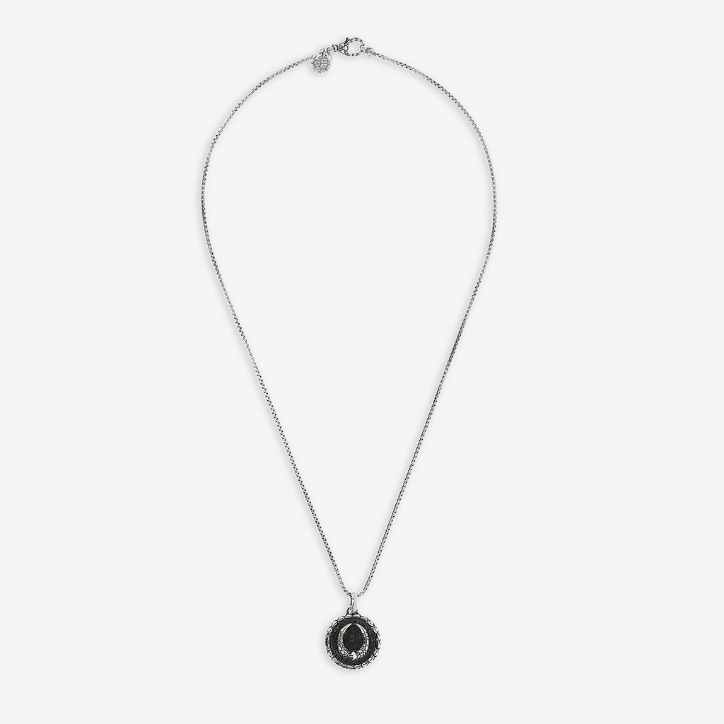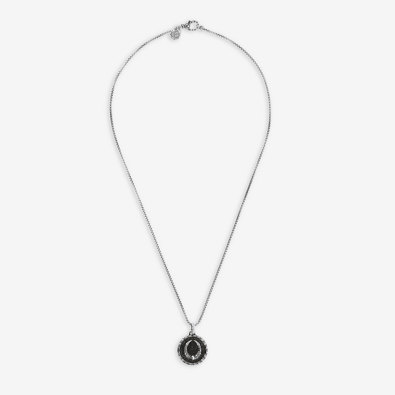 Collana uomo Albert M. realizzata su base di argento 925 con catena impreziosita da un pendente tondo dalla texture sirena con elemento in rilievo (corno, ancora, rosa dei venti o pugnale); chiusura a moschettone. Creazione dal design definito che può essere facilmente indossata con qualsiasi abito.
