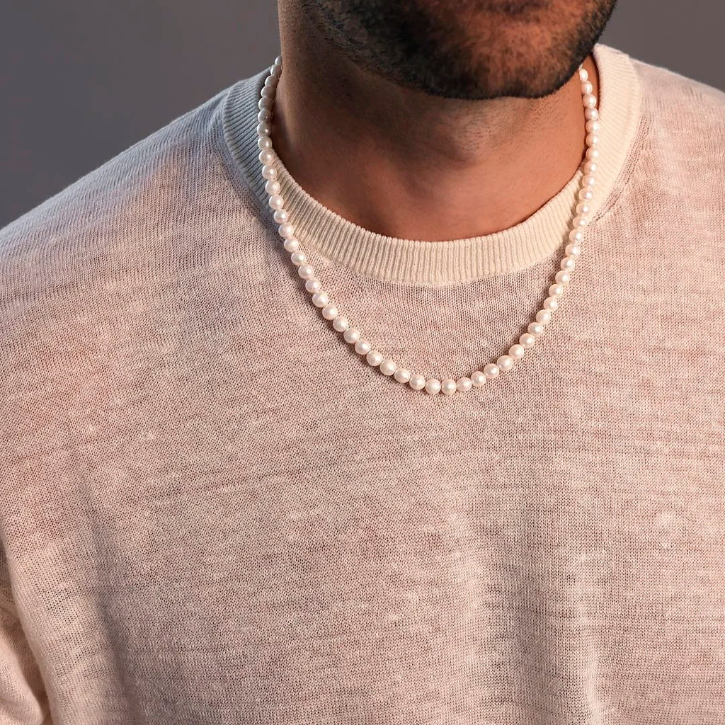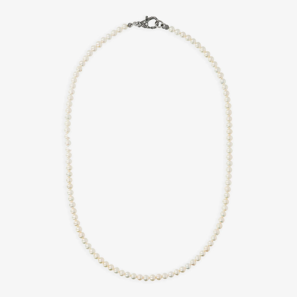 Collana unisex Albert M. realizzata su base di argento 925 con perle coltivate d'acqua dolce bianche; diametro di circa 4/4.5 mm; chiusura a moschettone texture sirena. Creazione dal design definito che può essere facilmente indossata con qualsiasi abito.