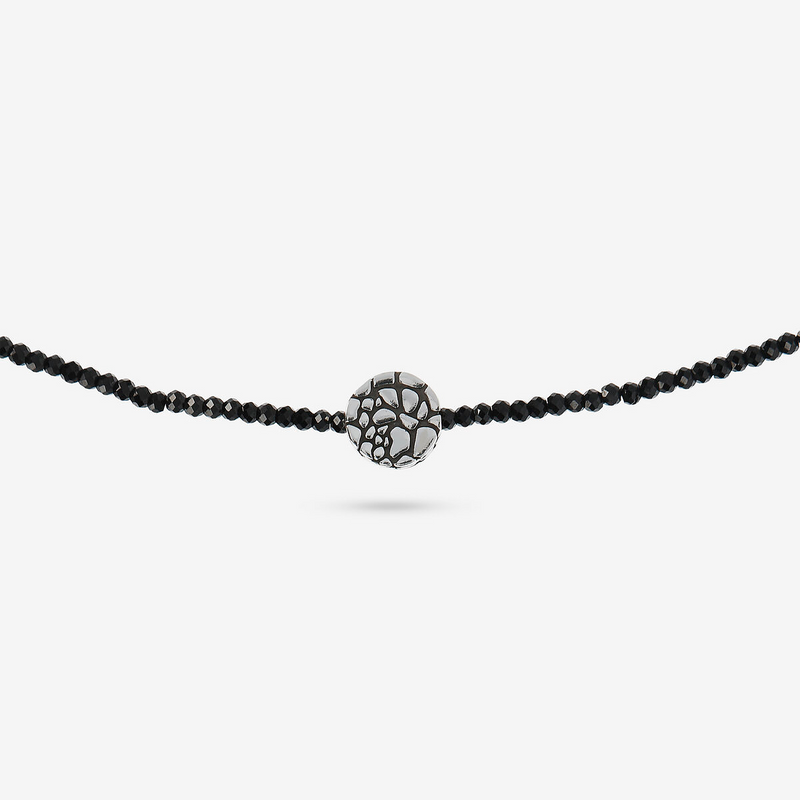 Collana girocollo di spinelli neri sfaccettati Albert M. impreziosita da un pendente tondo in Argento 925, placcato Rodio, con superficie texture. Lunghezza 40.5 cm. Chiusura a moschettone texture sirena.
