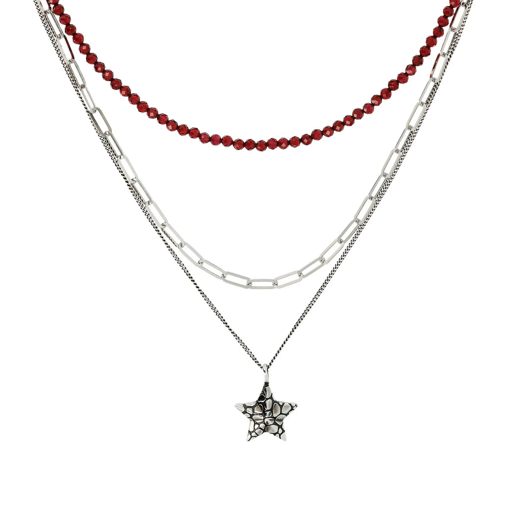 Collana Multifilo con Granato Rosso e Stella Texture Serpente in Argento 925