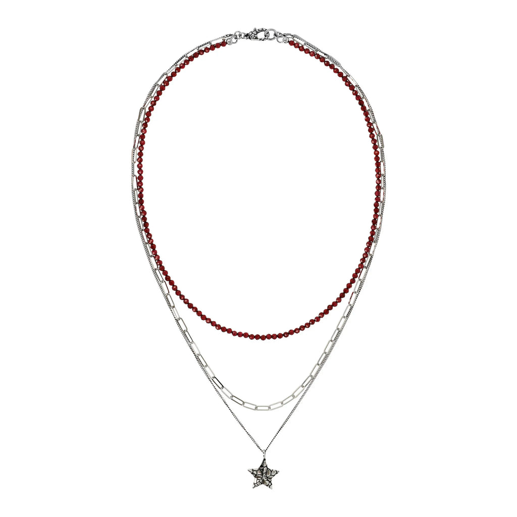 Collana multifilo donna Albert M. realizzata su base di argento 925 composta da tre catene diverse tra loro: una catena girocollo di 42.5 cm impreziosita da piccole pietre naturali (granato rosso), una catena forzatina allungata di 47 cm e una catena rolo di 49 cm con un ciondolo a forma di stella dalla texture serpente; chiusura a moschettone con texture. Il color rosso delle pietre, abbinato alla texture serpente, donano una nota sensuale e misteriosa a questa creazione.
