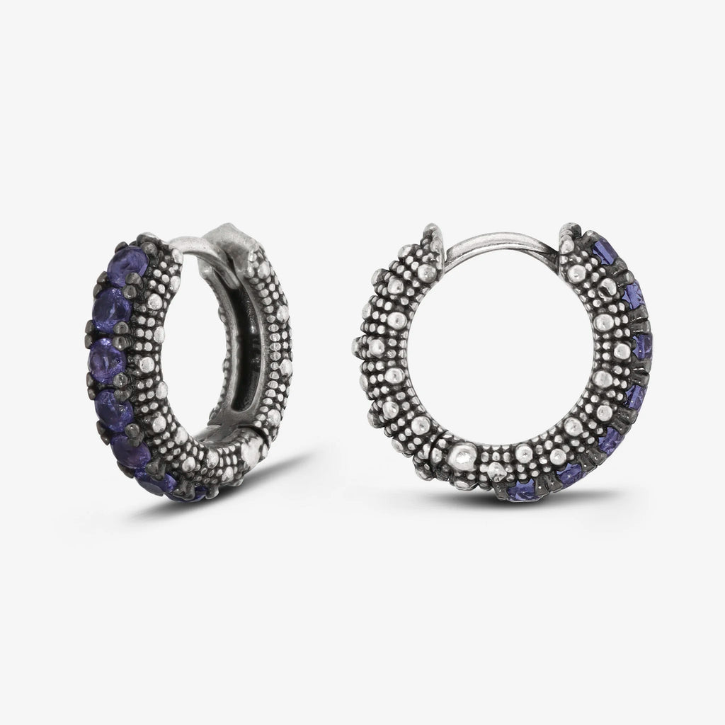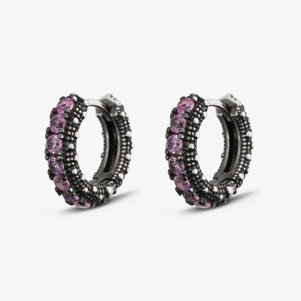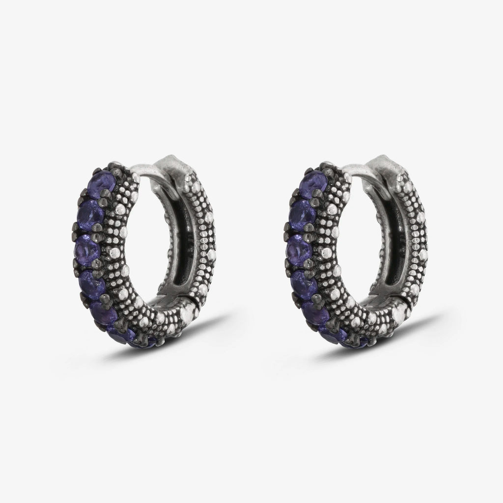 Orecchini a cerchio piccoli Albert M. realizzati in Argento 925 con superficie texture riccio di mare impreziositi da pietre. Chiusura con perno a incastro.