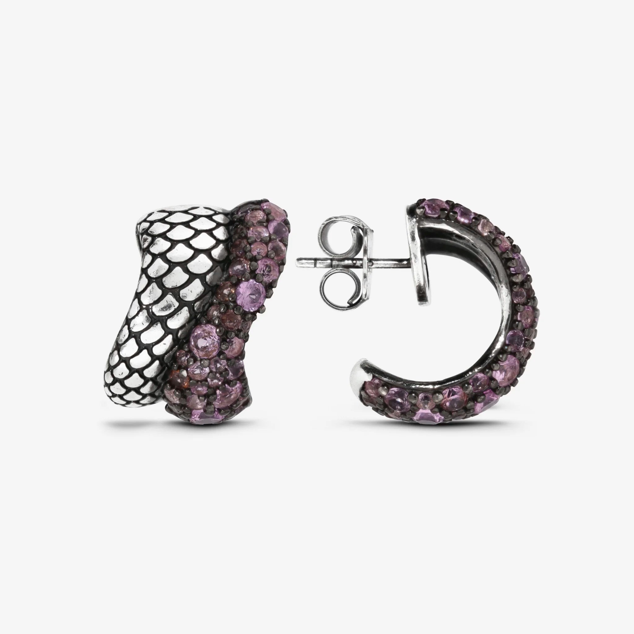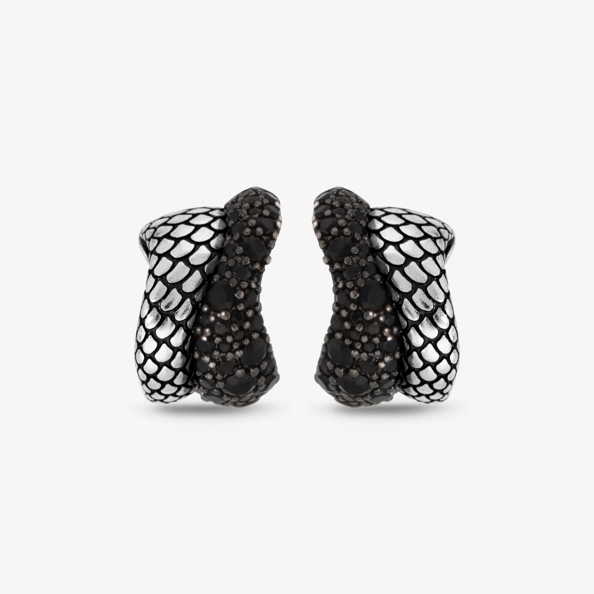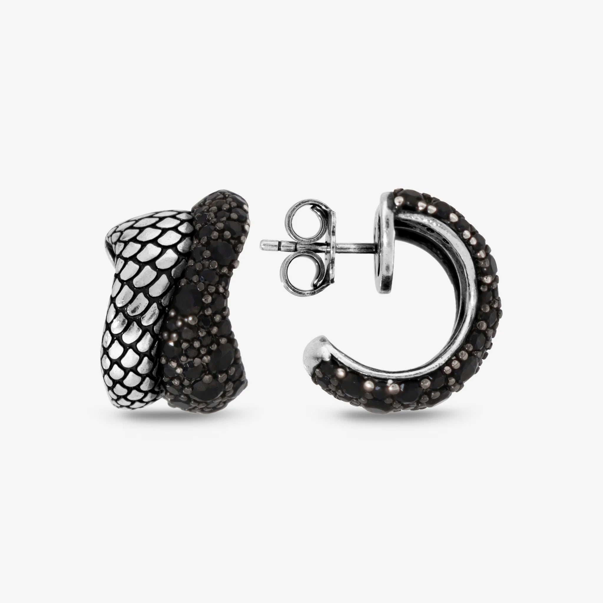 Orecchini a lobo Albert M. realizzati in Argento 925, dal design a semicerchio sinuoso con superficie texture sirena e pavé. Chiusura a perno e farfalla.