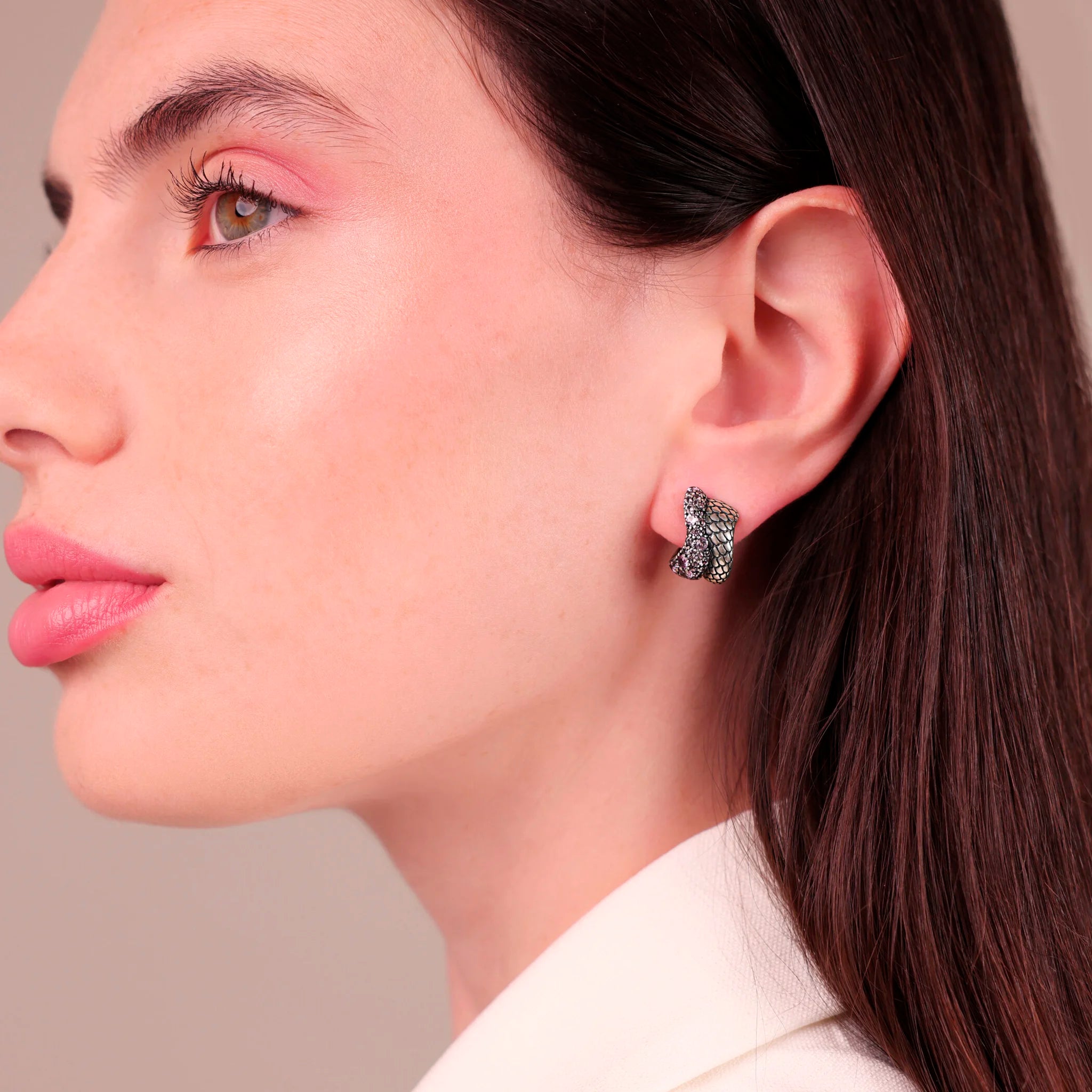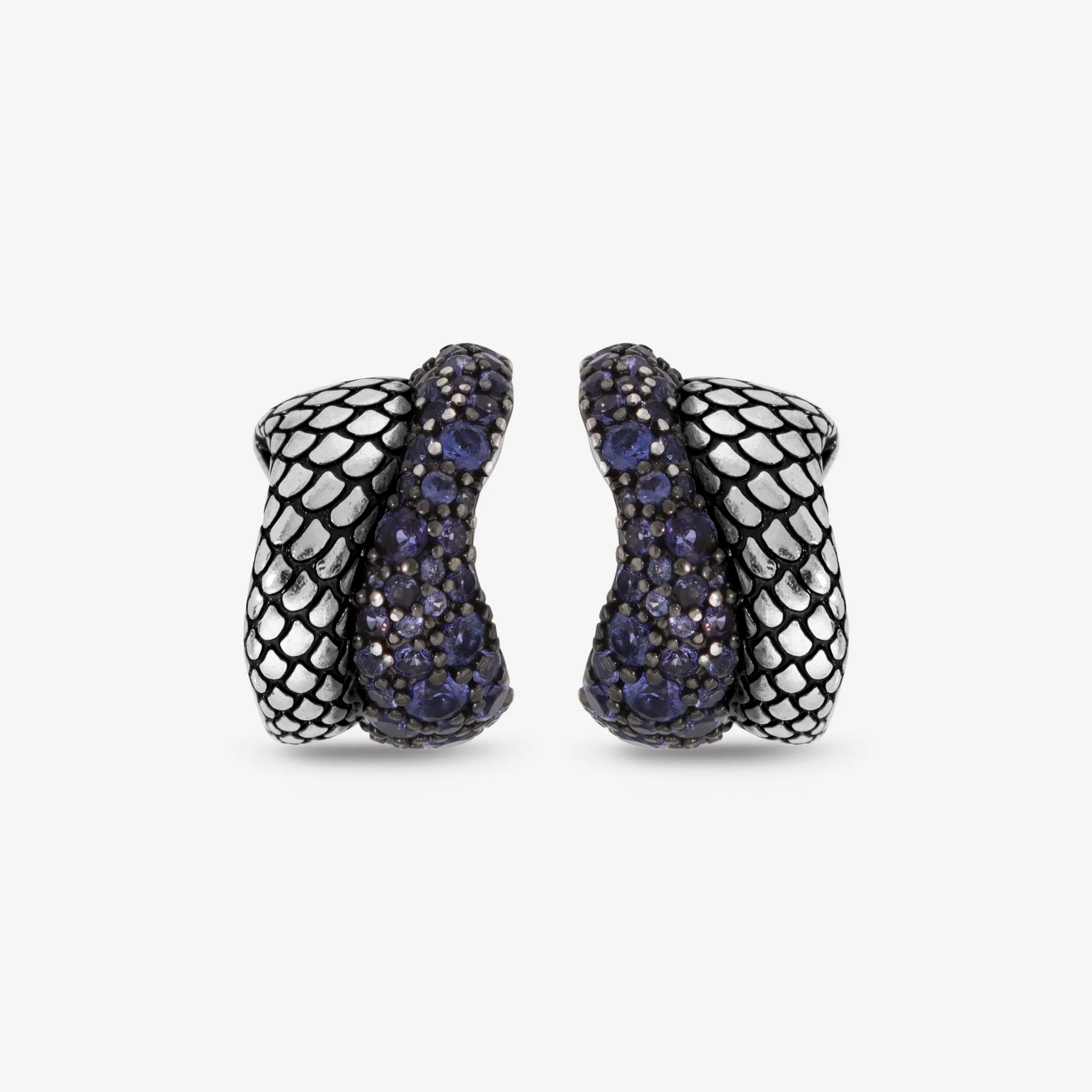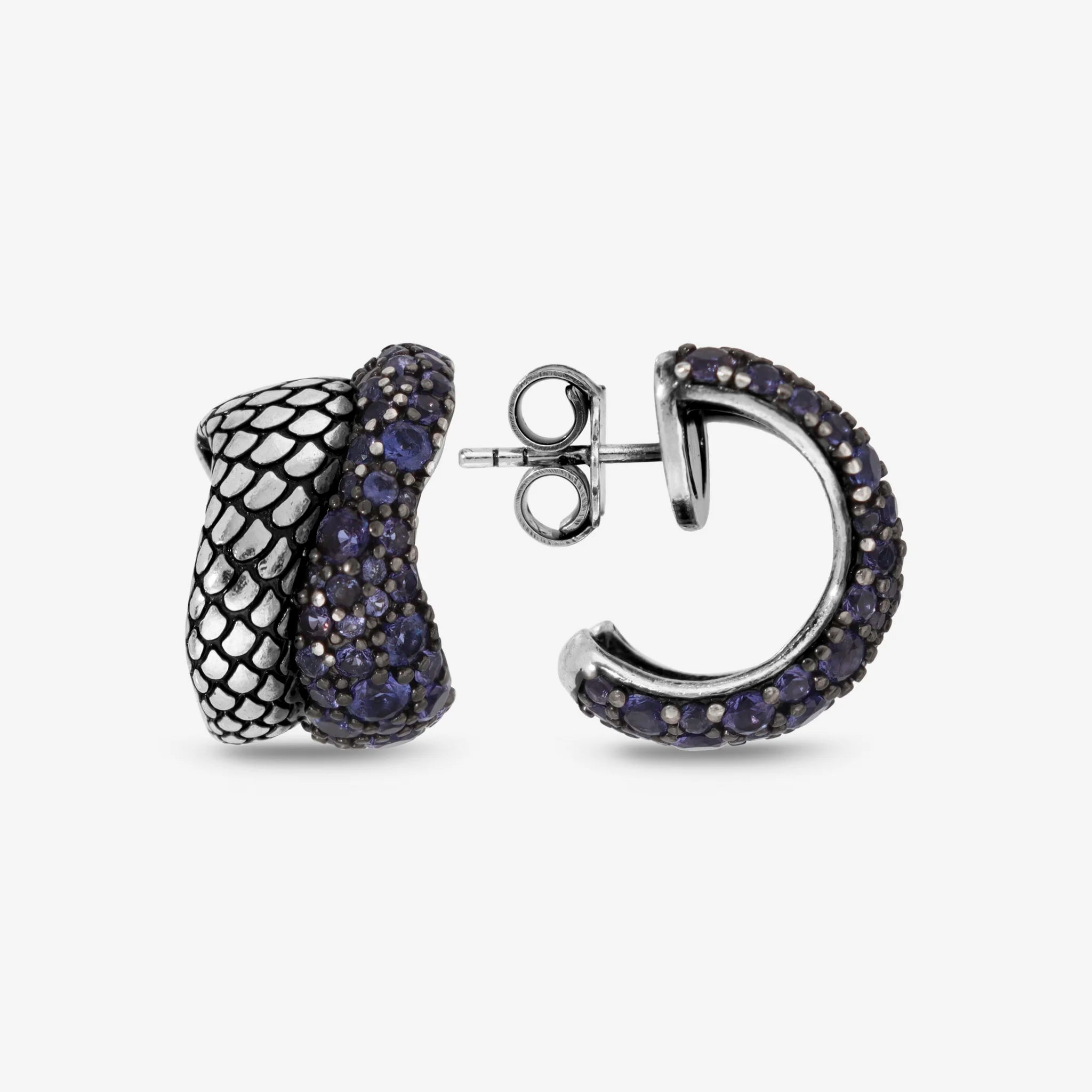 Orecchini a lobo Albert M. realizzati in Argento 925, dal design a semicerchio sinuoso con superficie texture sirena e pavé. Chiusura a perno e farfalla.